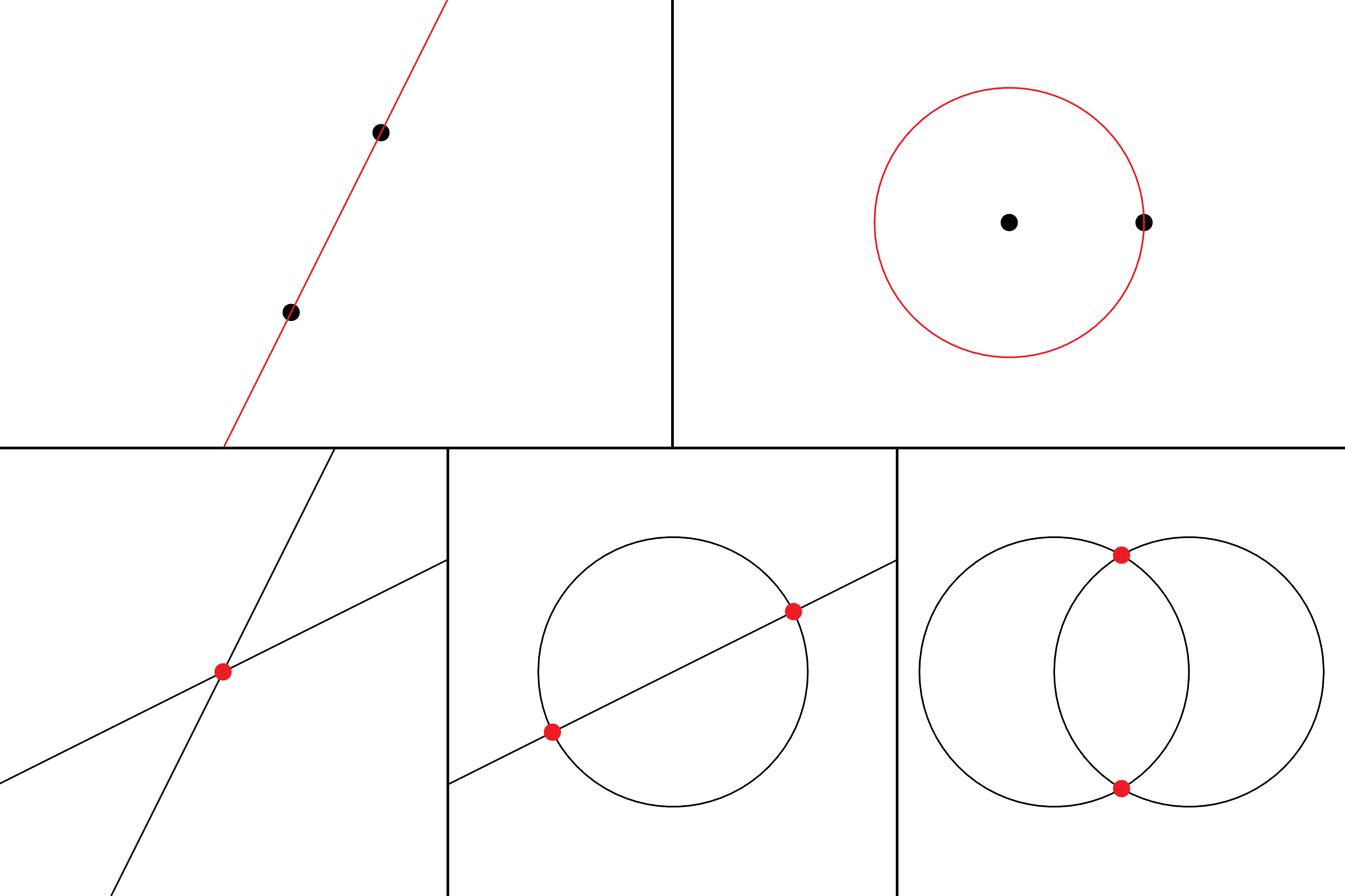 ). There are five ways a geometric object can be added in a construction: by drawing a line through two points, by drawing a circle with center one point through another point, or by creating a point of intersection from two lines, a line and a circle, or two circles.