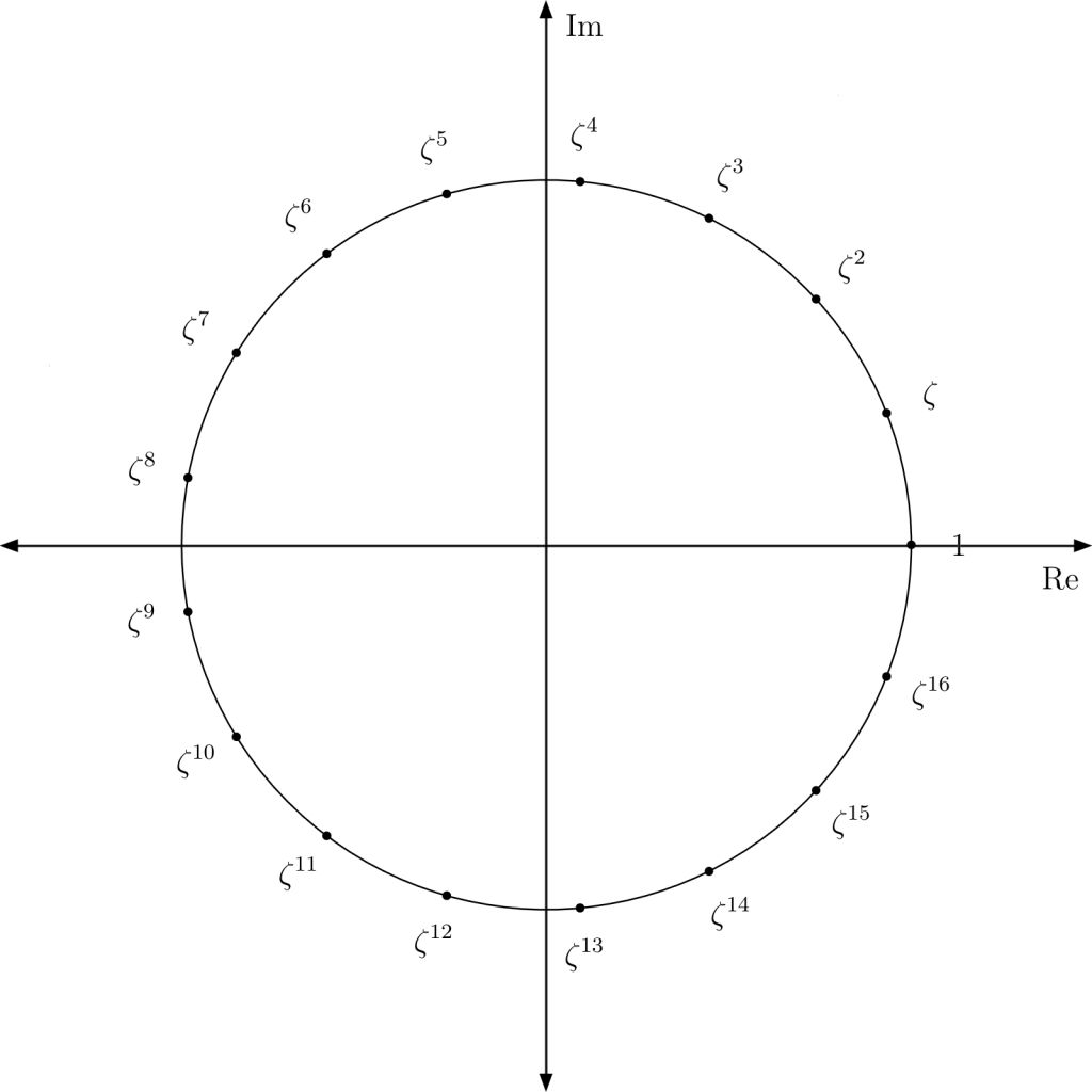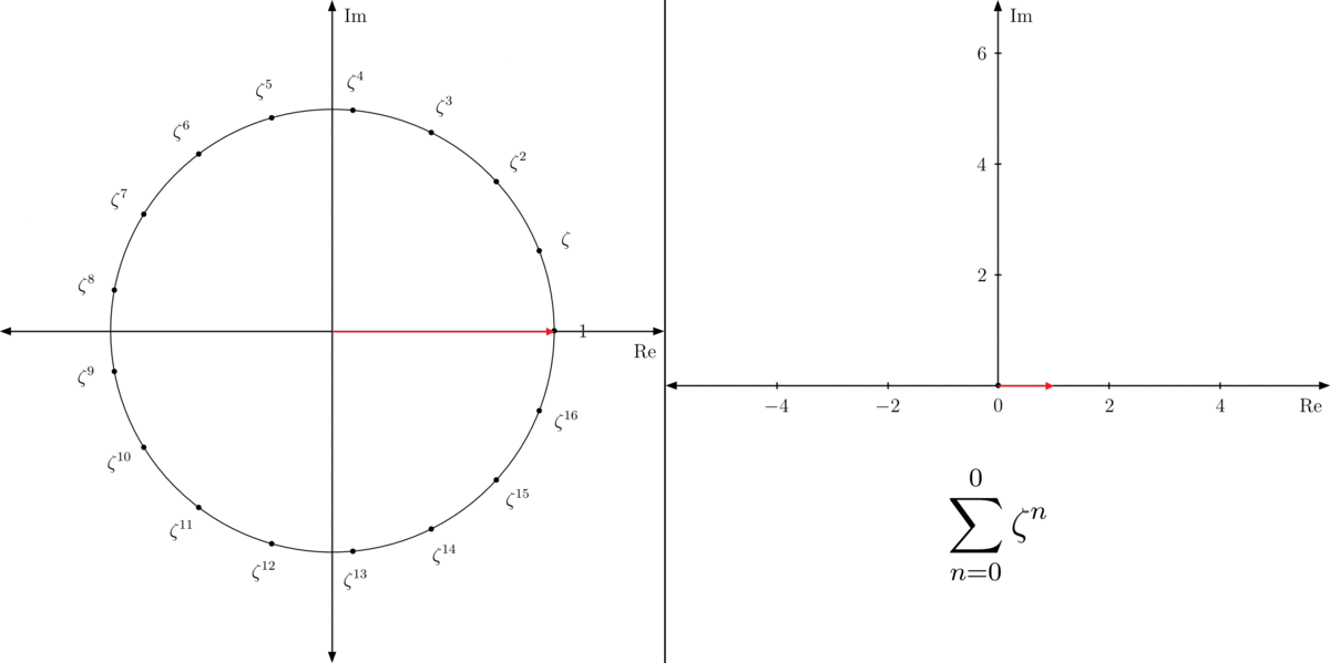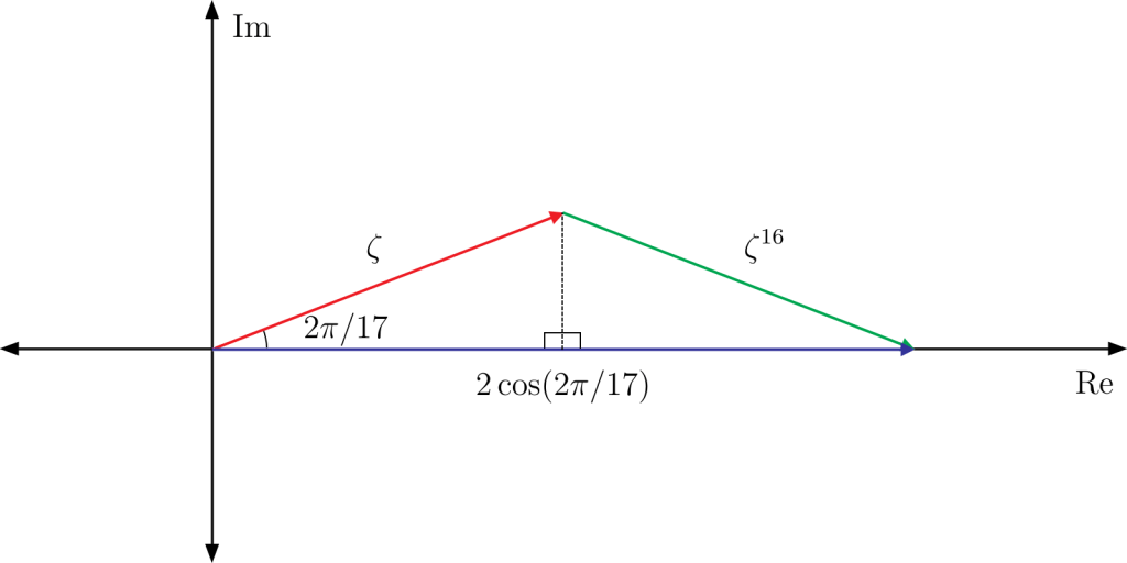 This is known as the seventeenth cyclotomic polynomial, and it’s easy to see that is one of its roots by viewing the complex numbers as vectors. The sum of all seventeen powers of